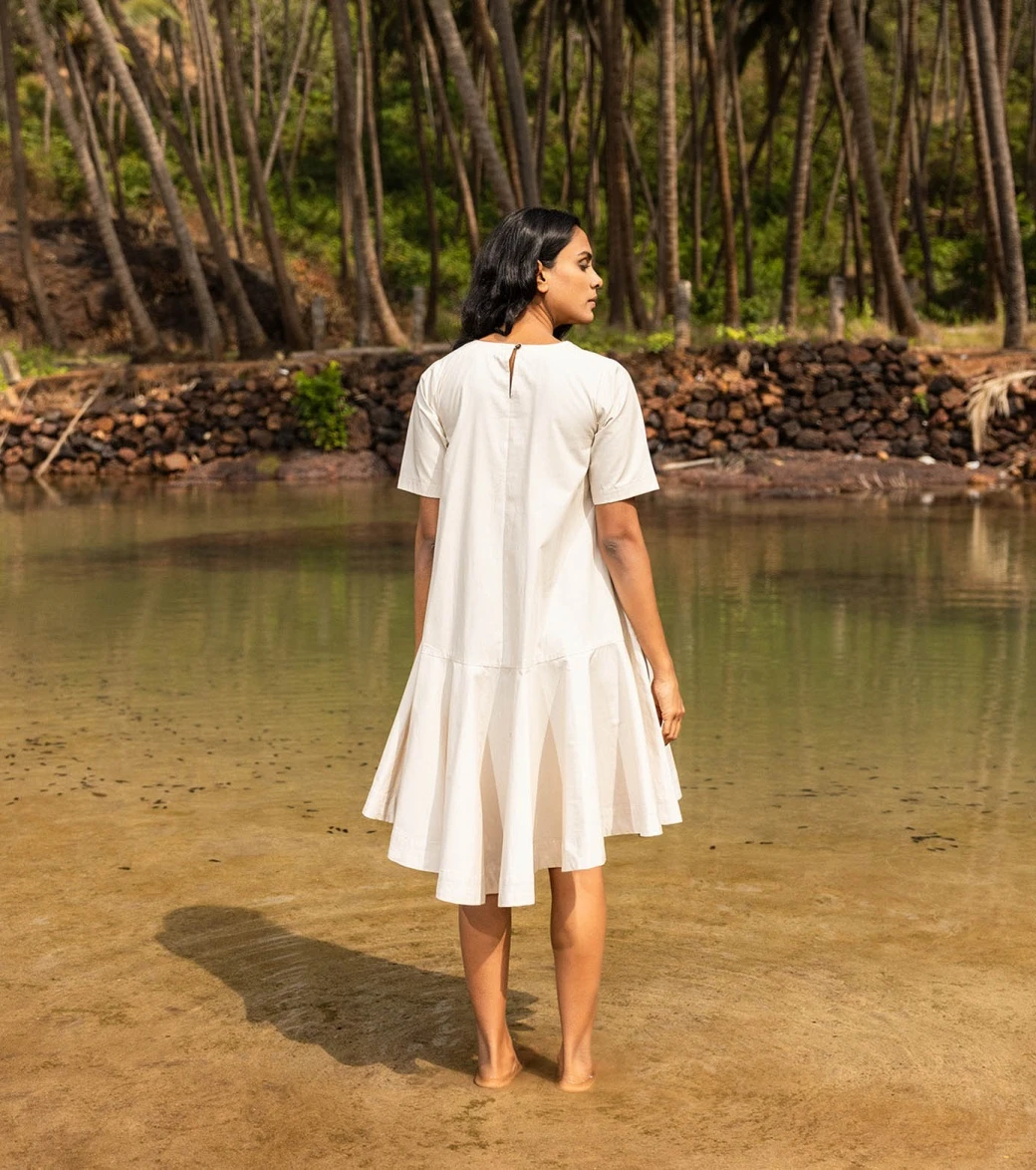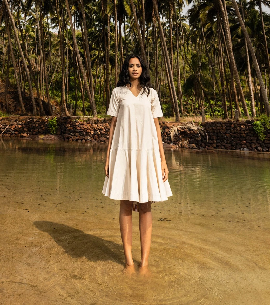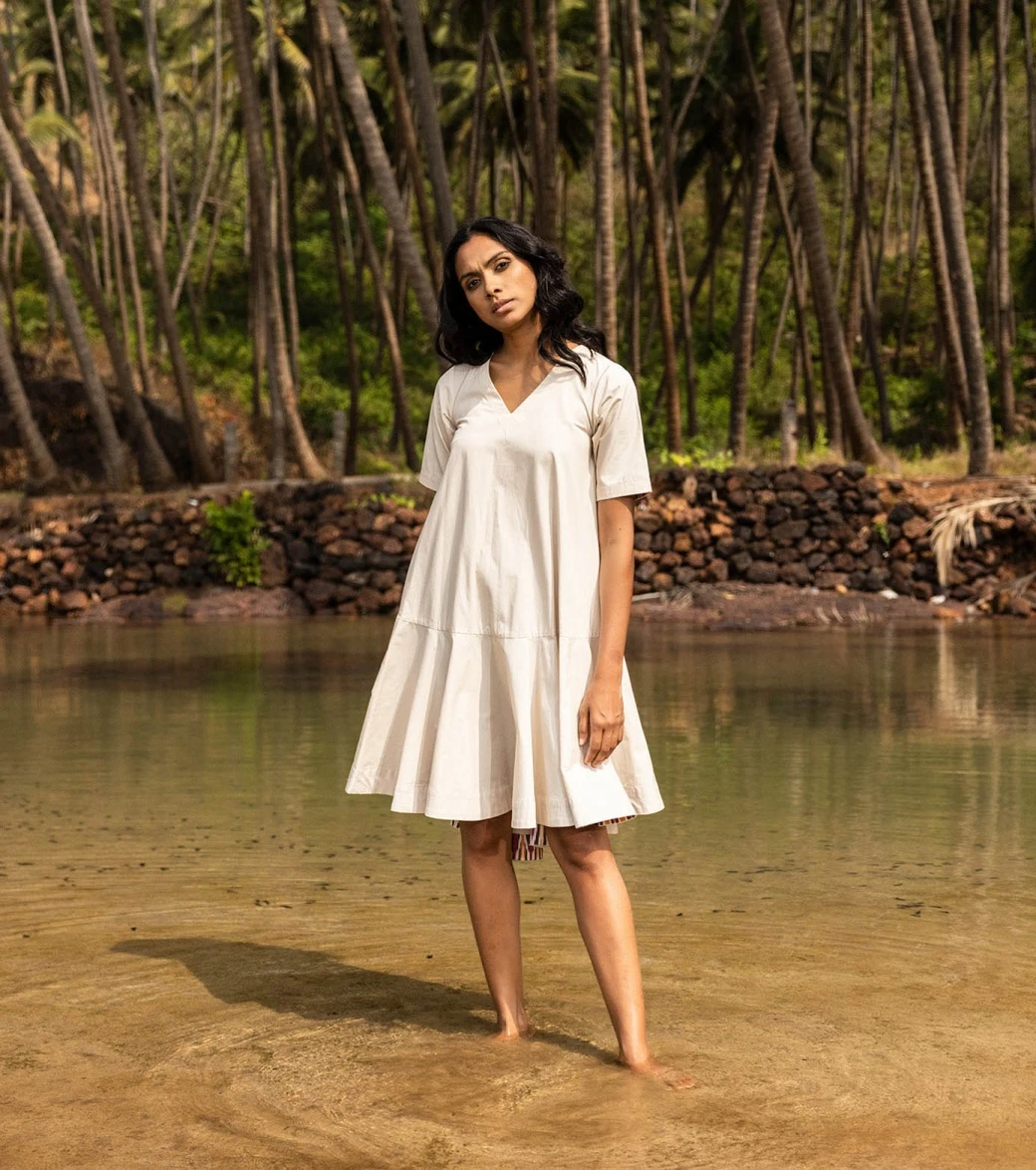 - A fit and flare v-neck dress with high and low detail in the flare comes with ikaat detailing at the hem inside
