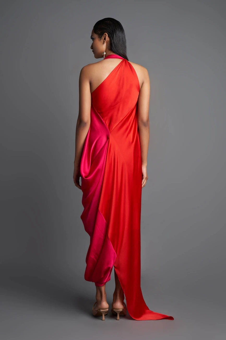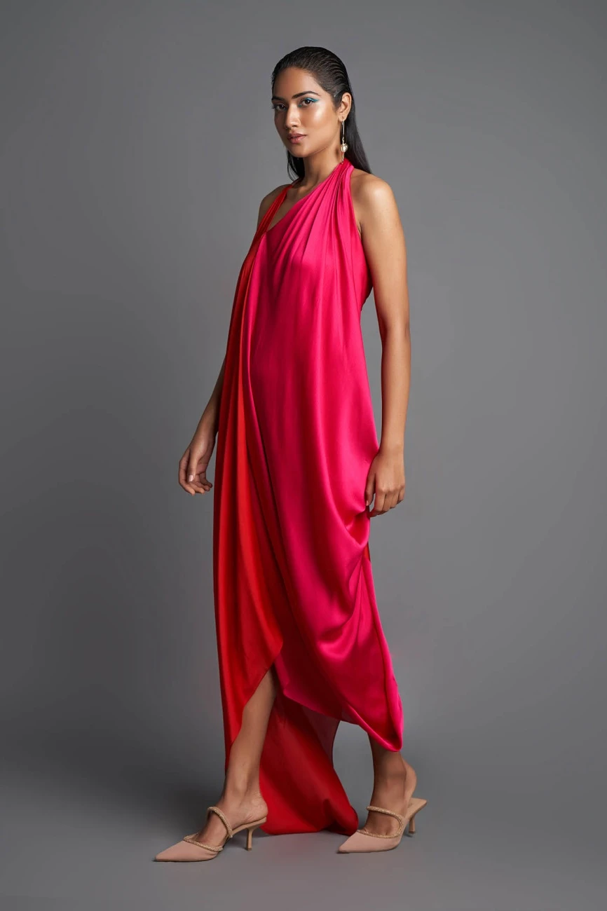 Pink And Red Asymmetric Draped Dress