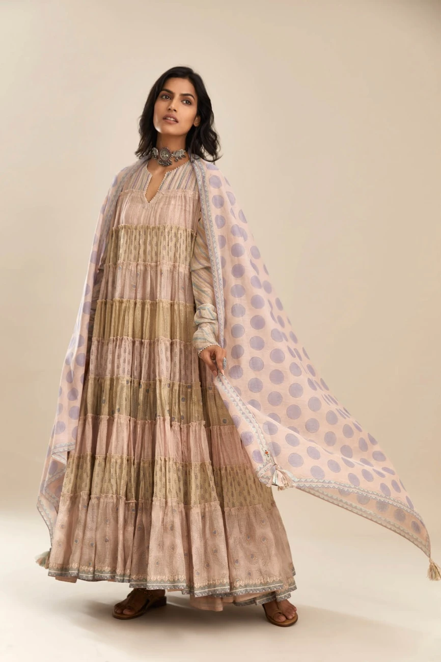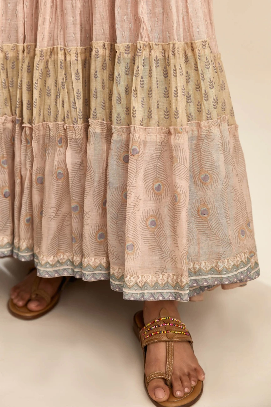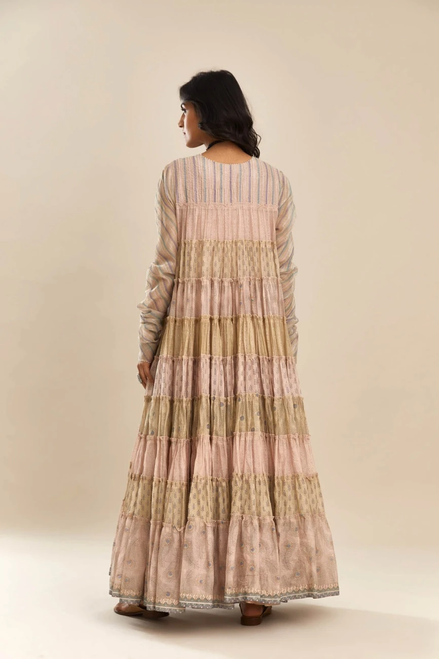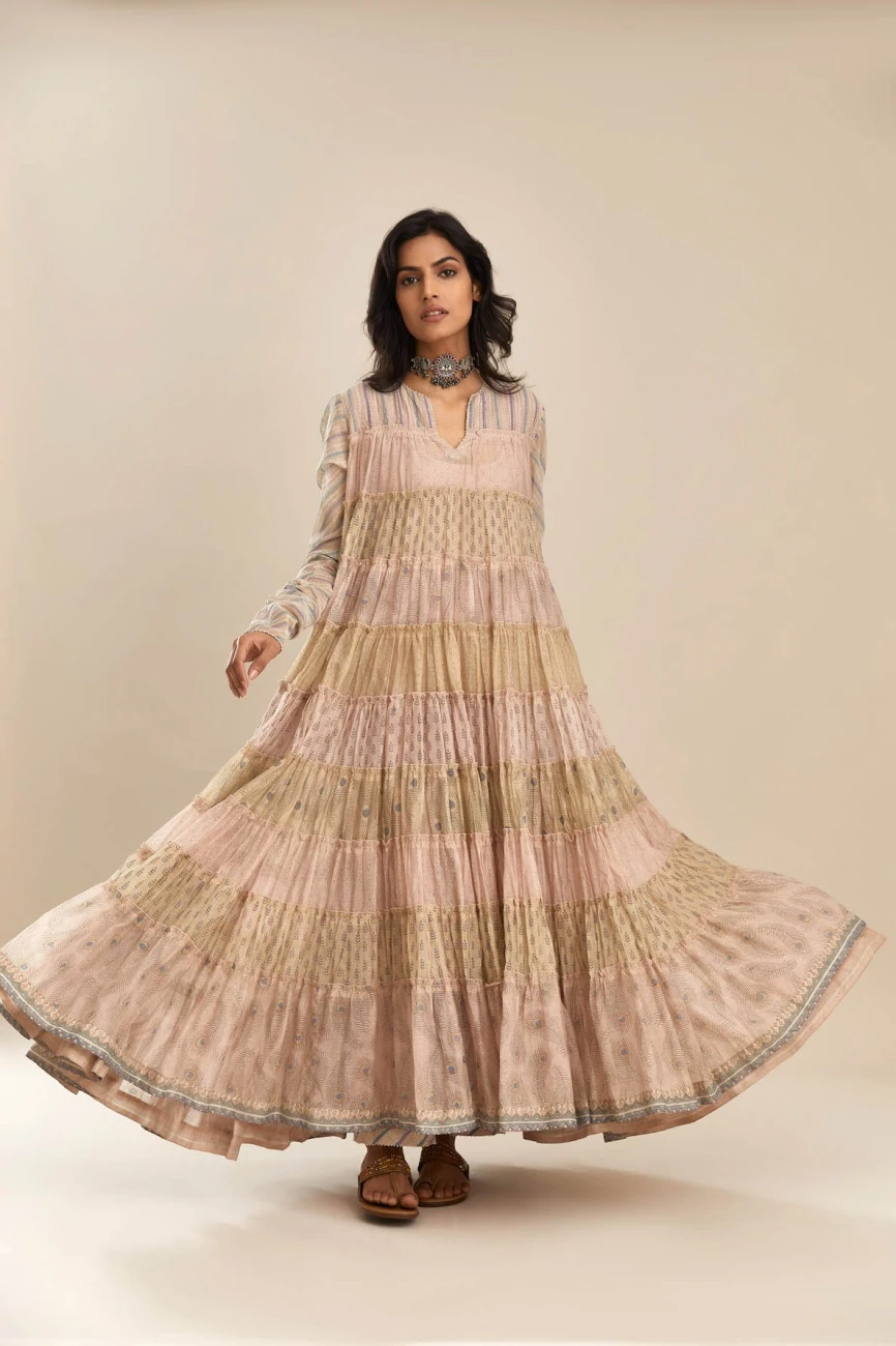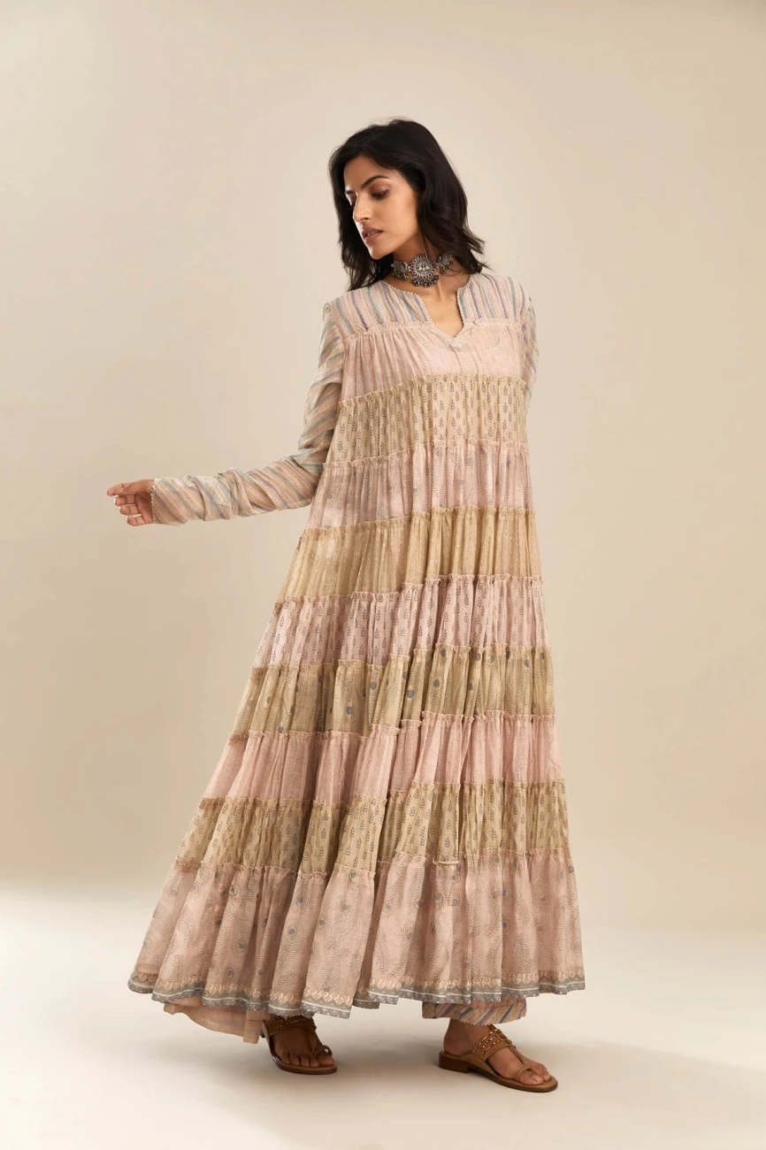 - Hand block printed multi-print, multi-tiered kurta dress with quilted yoke in front and back