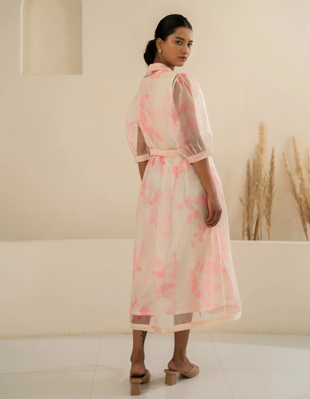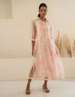 - Pink organza petal printed double layer dress