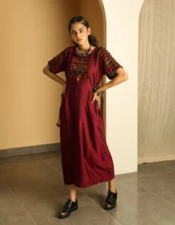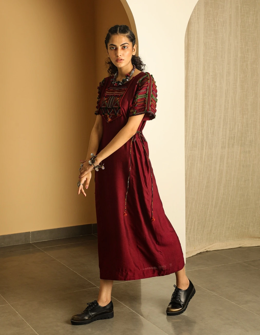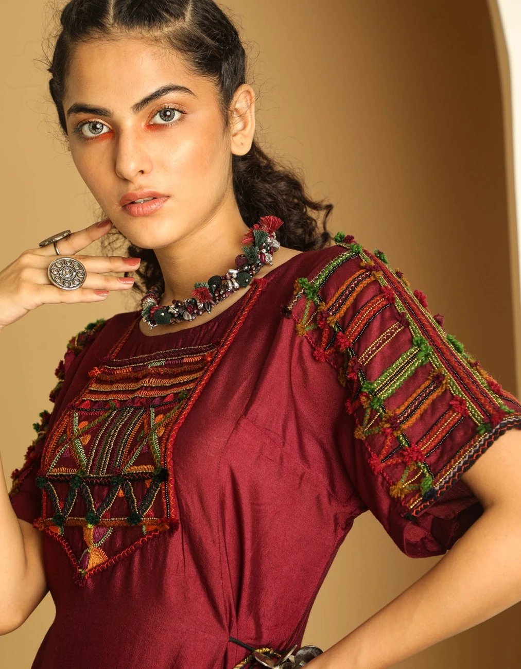 - Dress with Hand embroideryroidery at front yoke and sleeves, tassels handmade at waist cinching it , slit at back