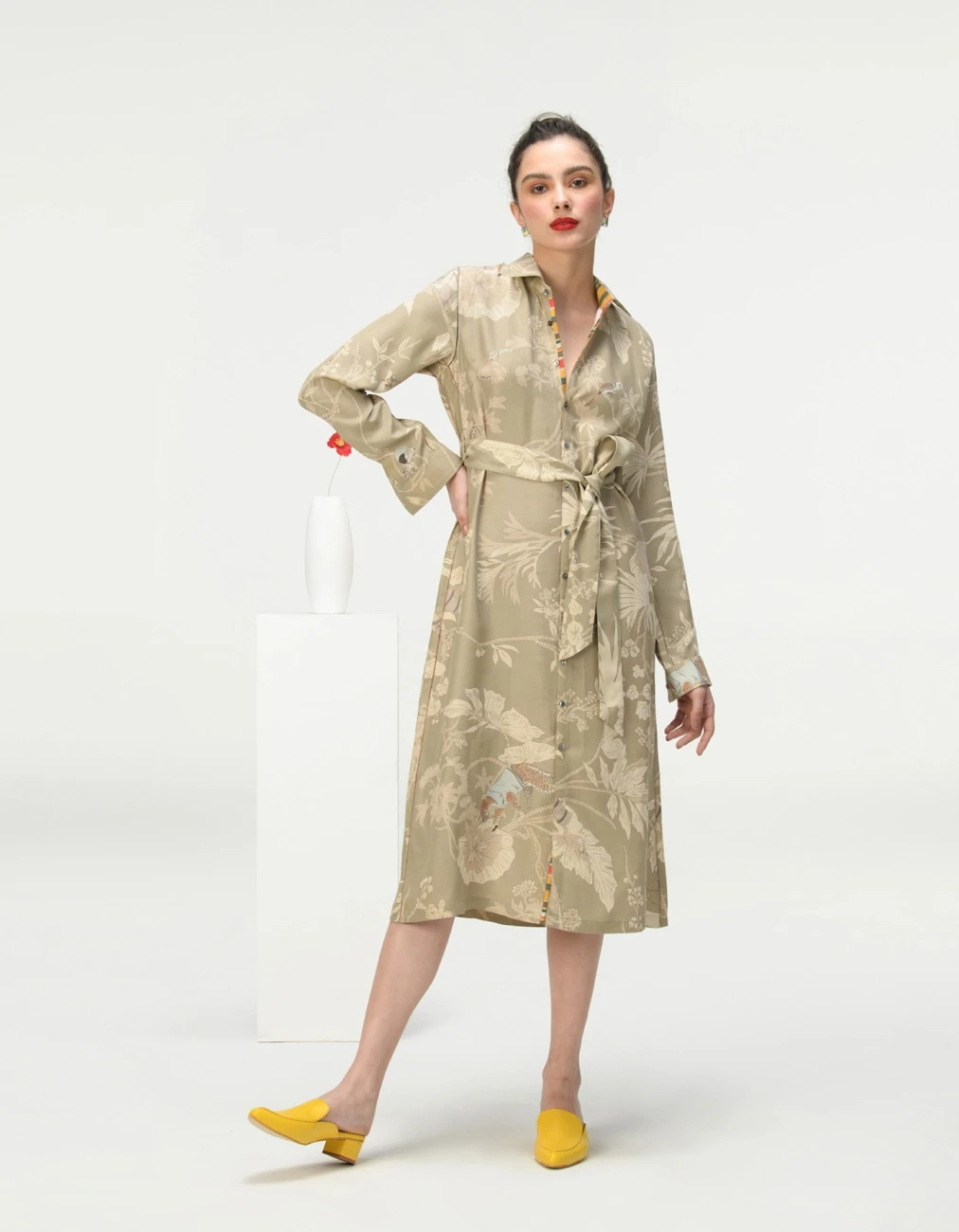 - Rainforest tie belt shirt dress oyster grey muga satin silk