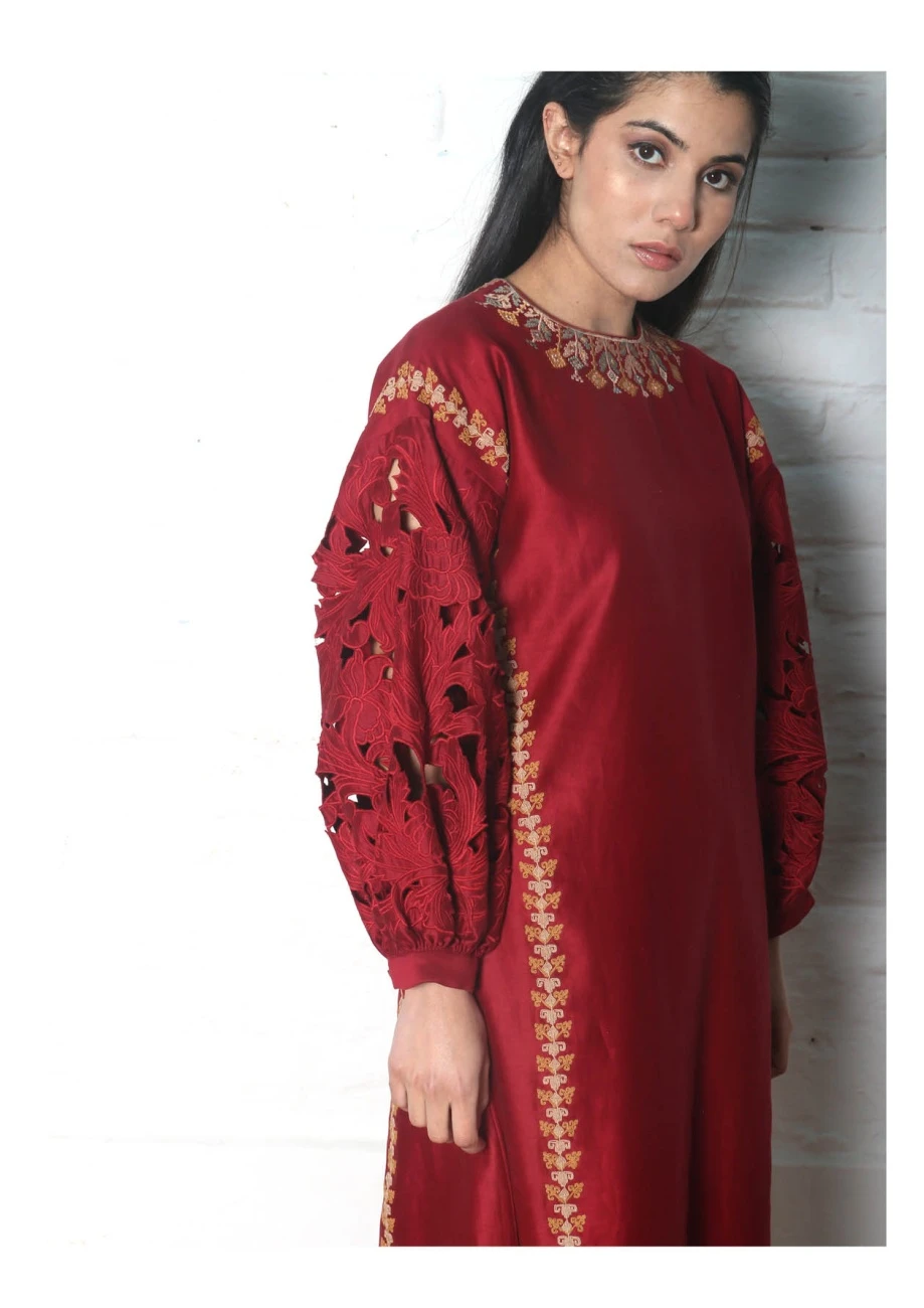 - Red chanderi dress kurta with cutwork sleeves