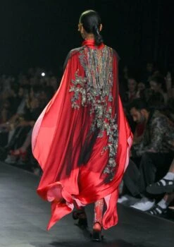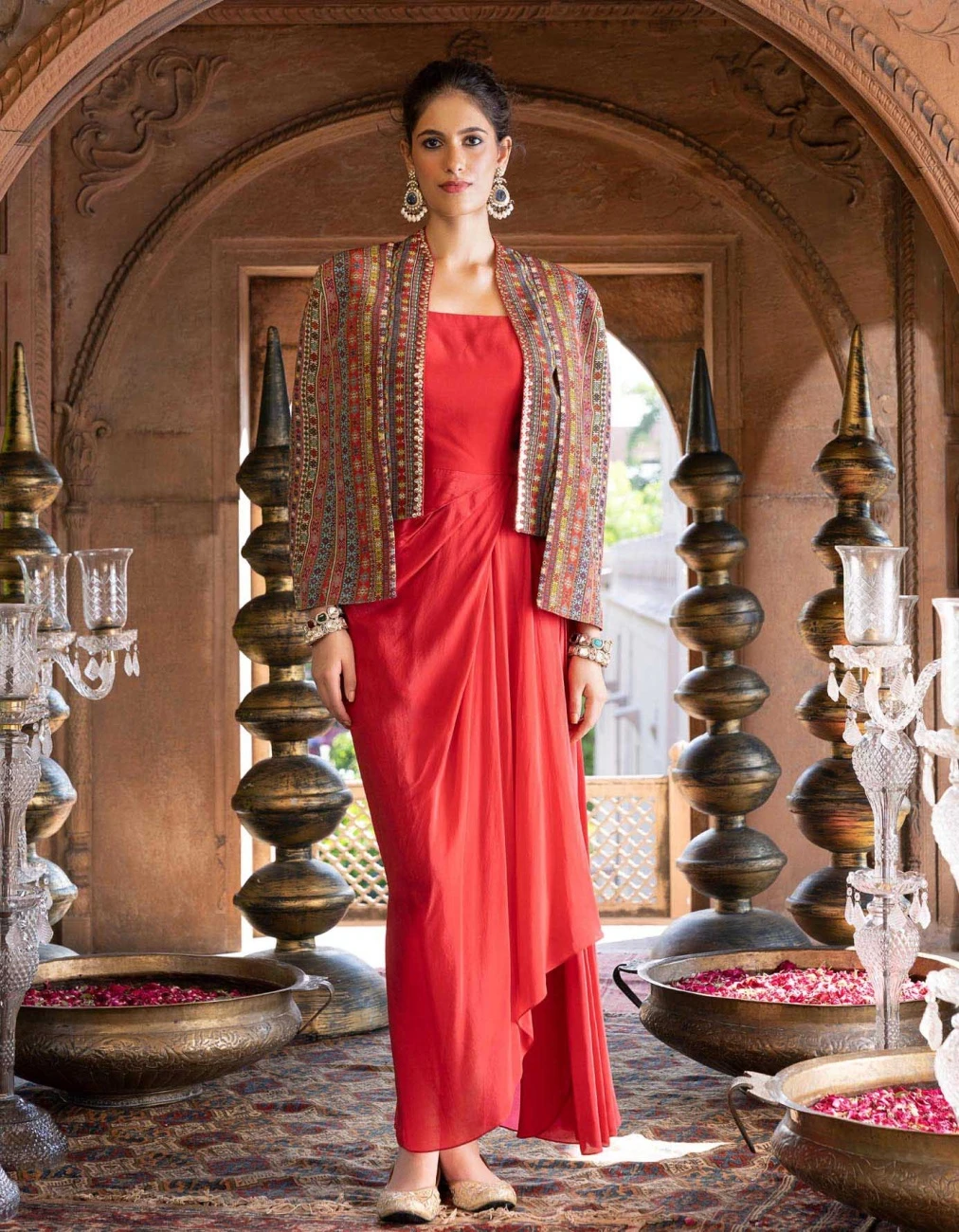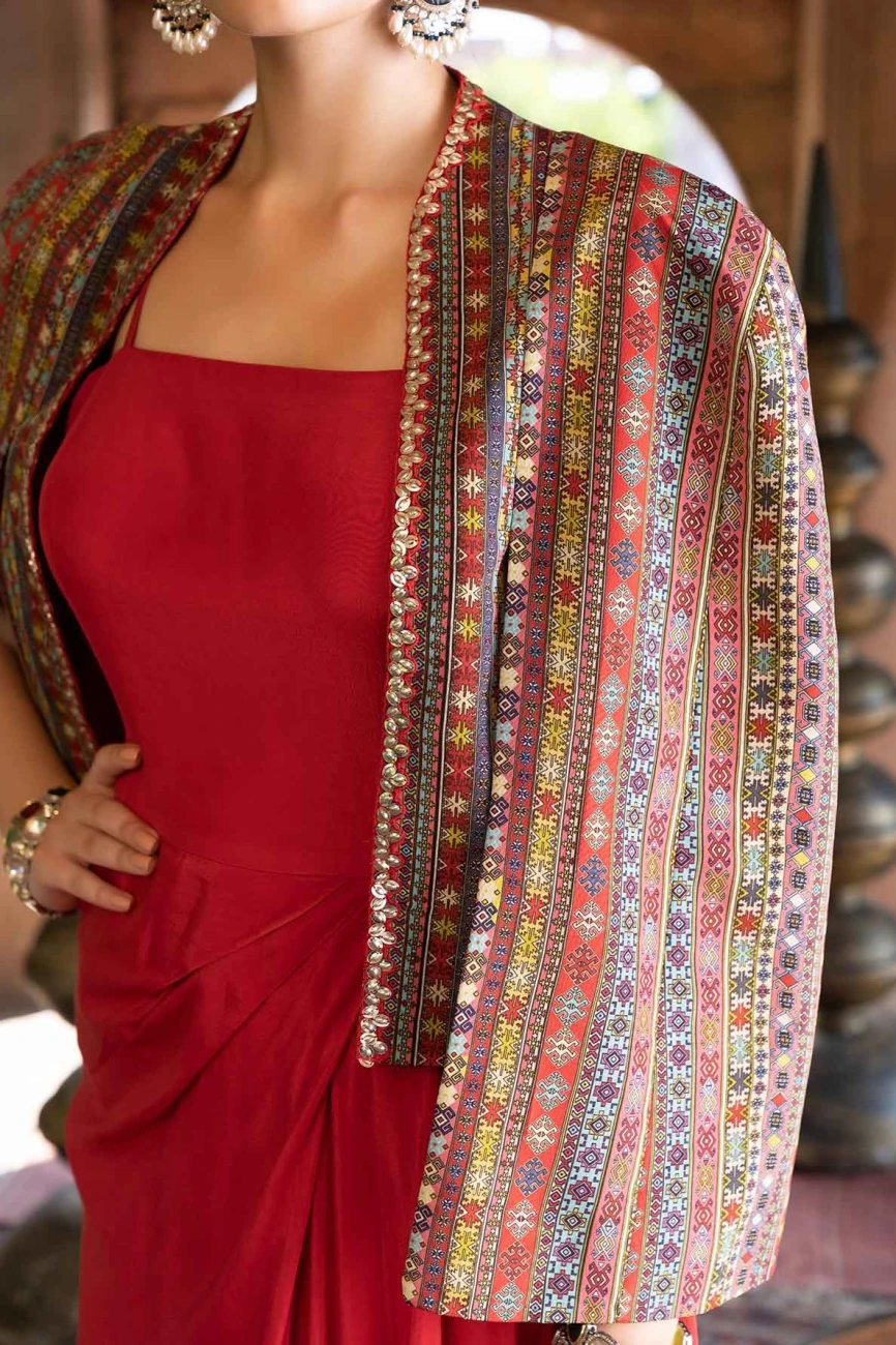- Red Draped Dress With Printed Cape Jacket
