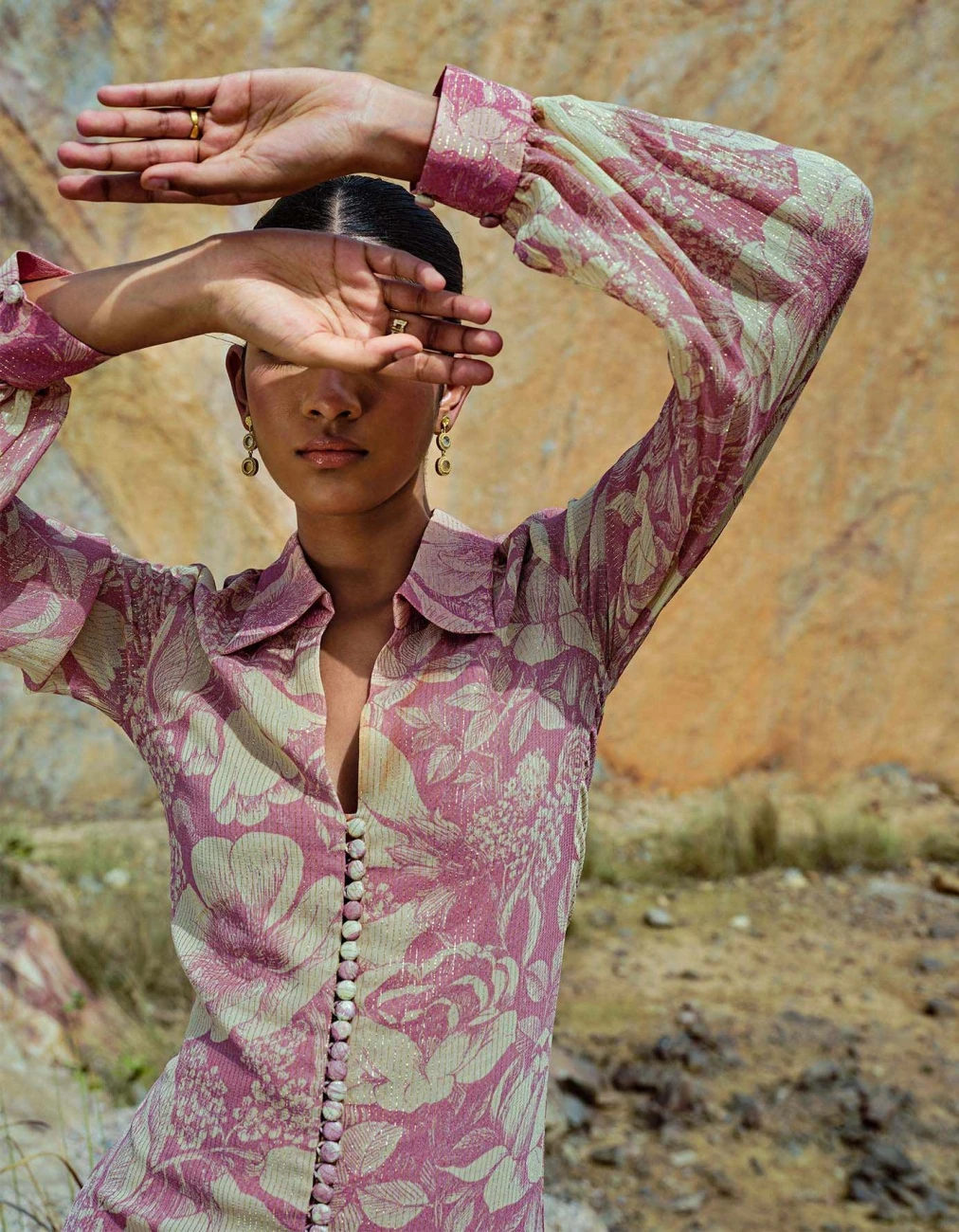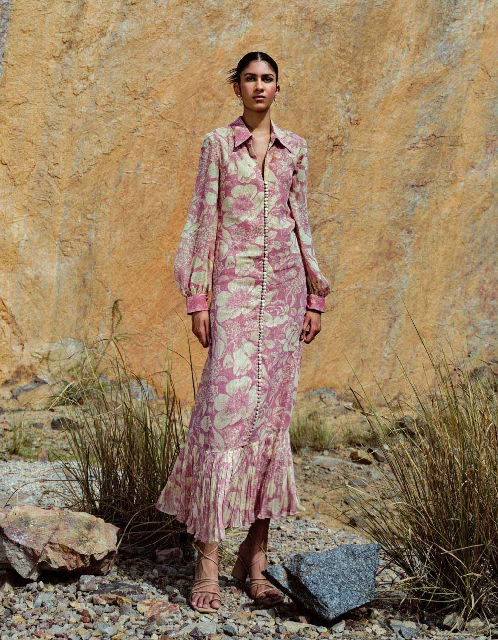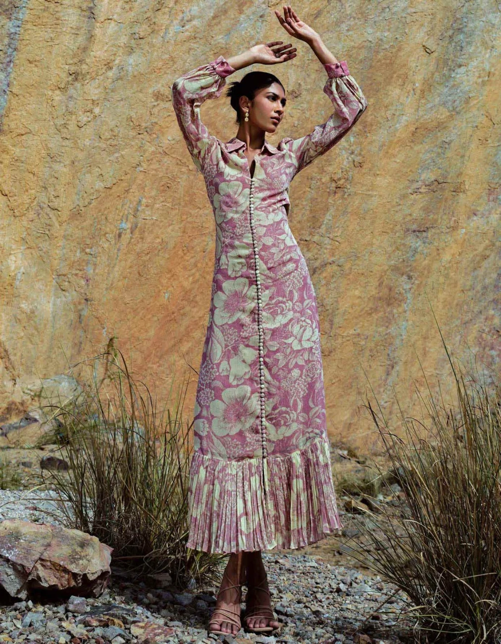 - Rose pink cross hatch lurex long Dress detailed with fabricated buttons and rushing