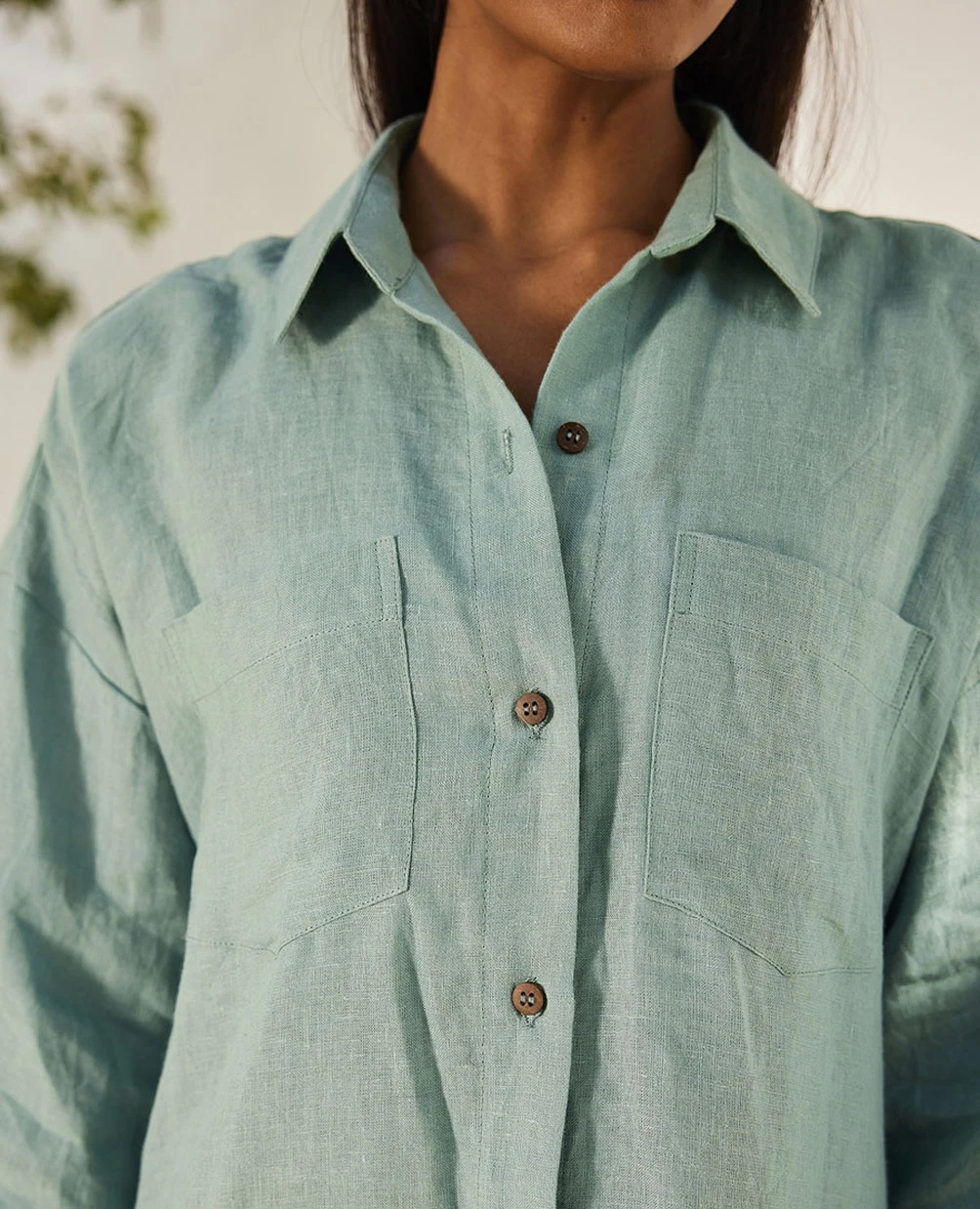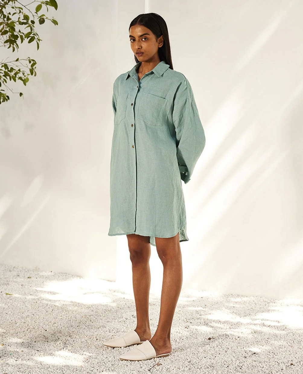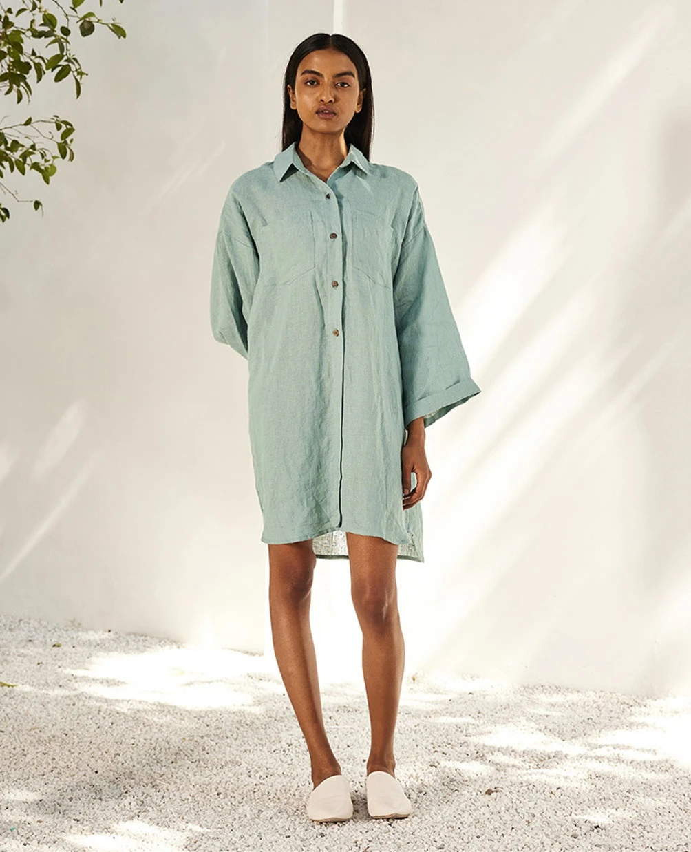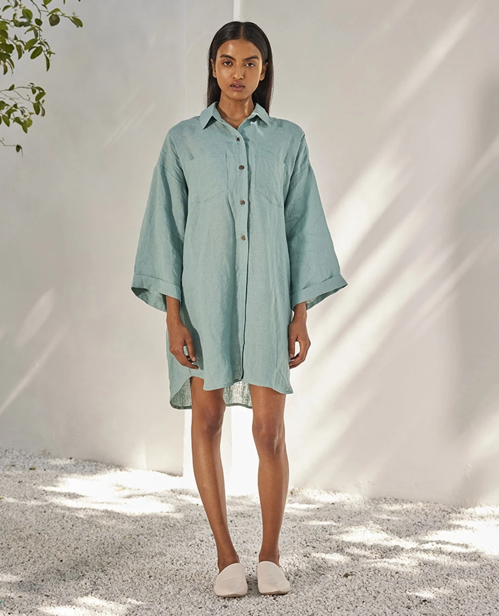 - A sage blue linen shirt dress with front button opening and a folded sleeve hem
