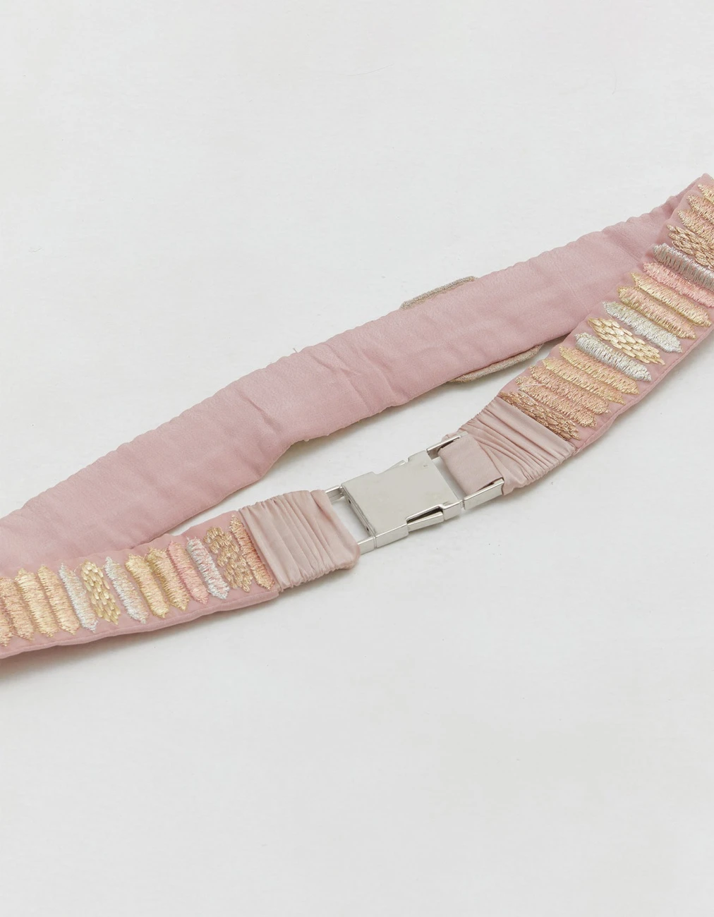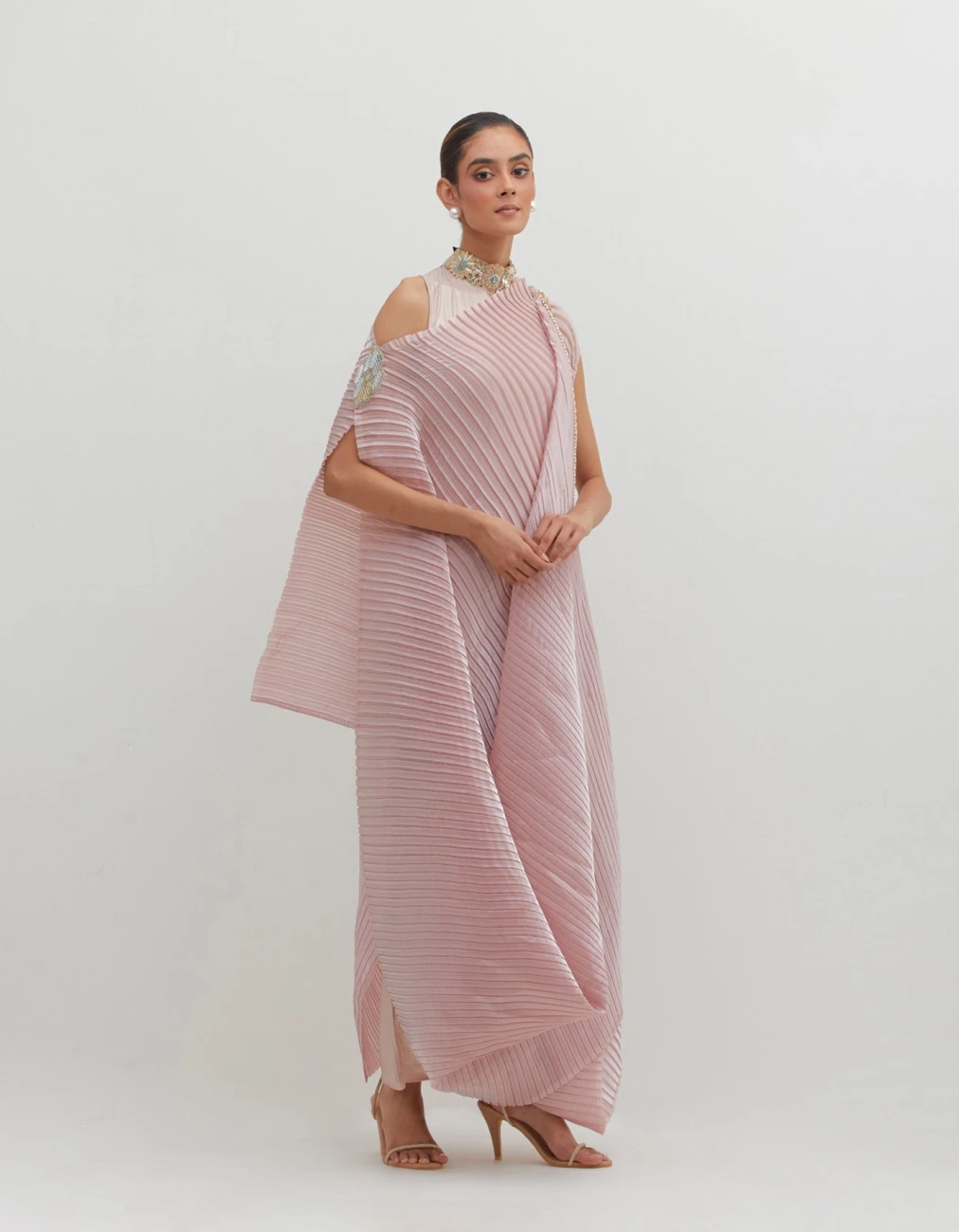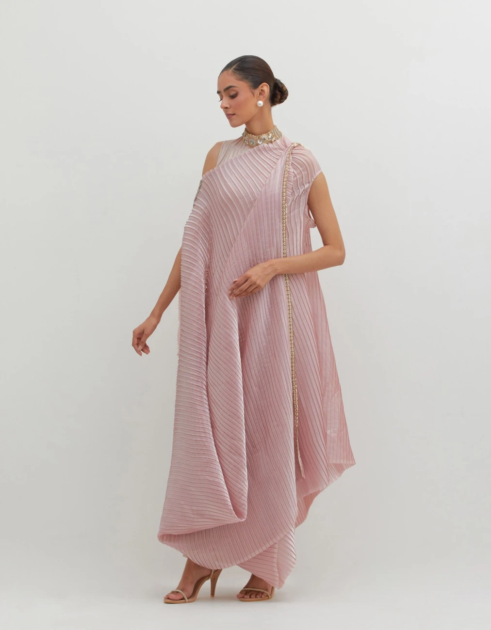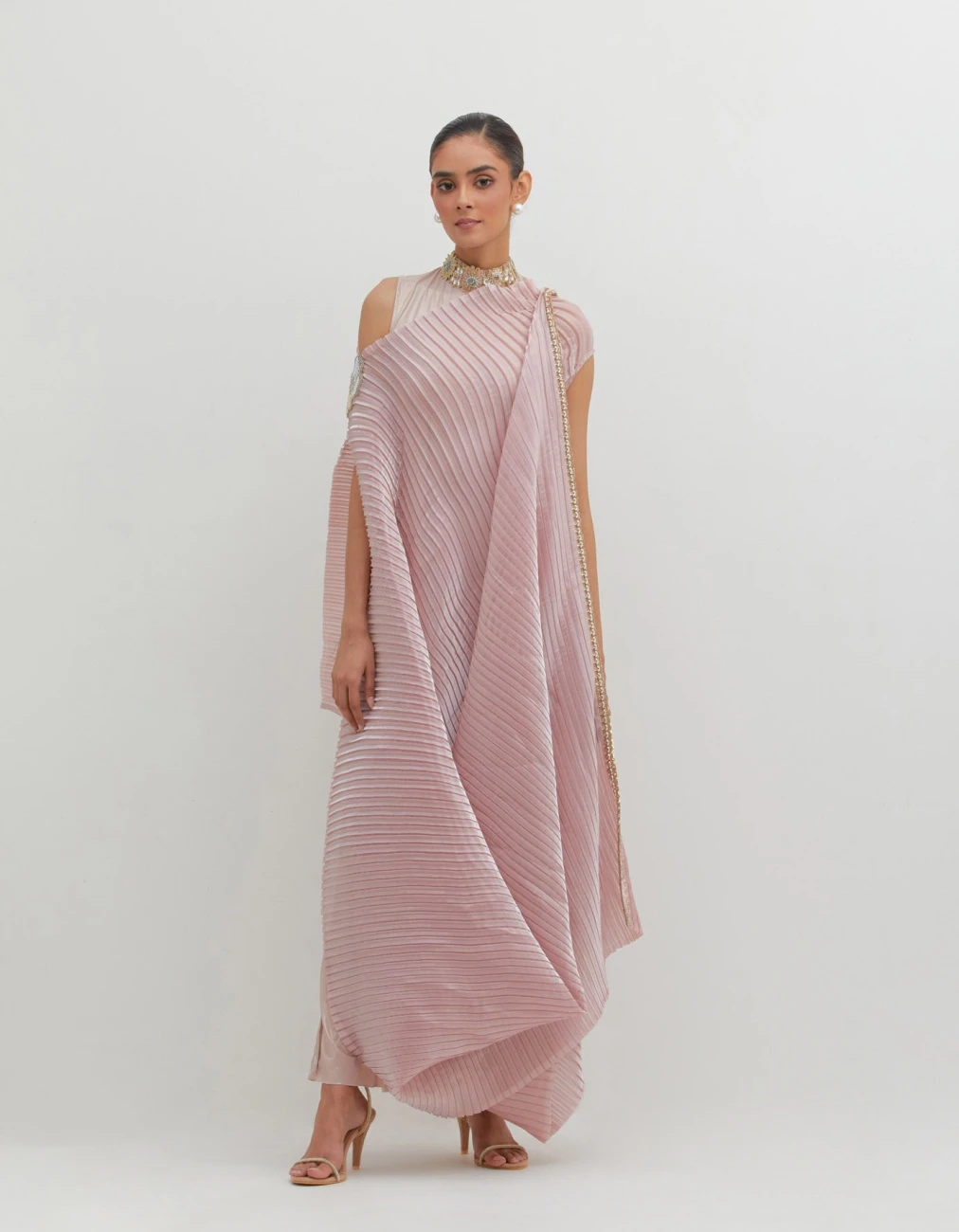 - Salmon pink pleated drape with motif and tassel detail with jersey long dress with collar detail