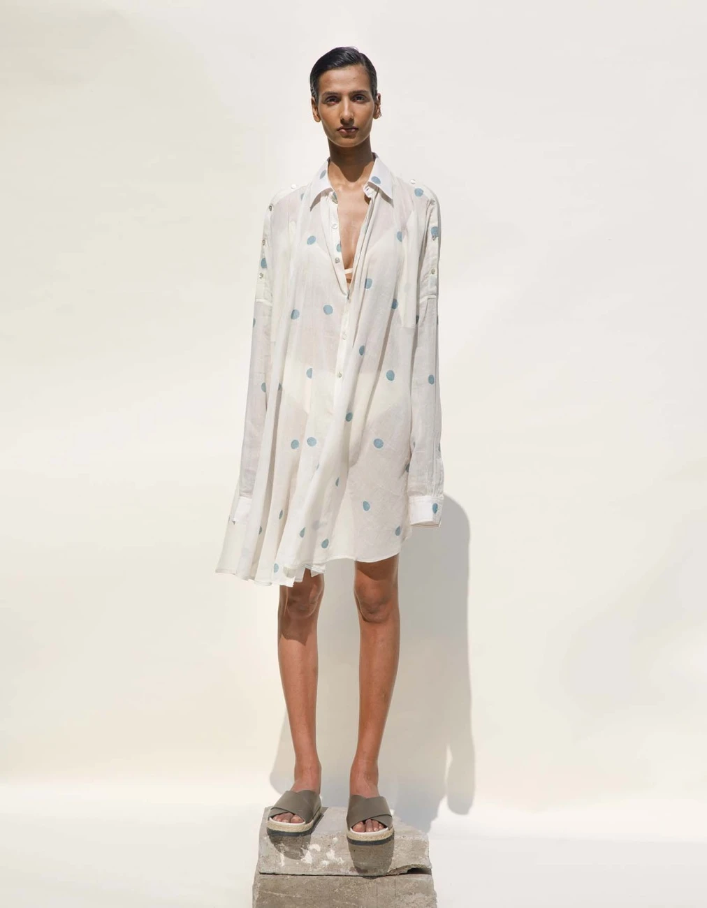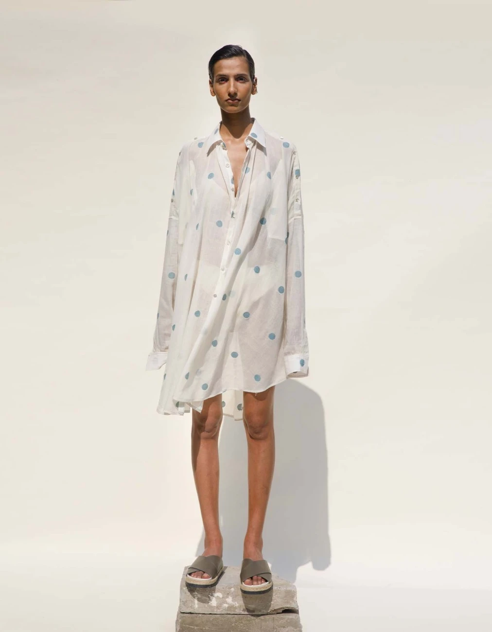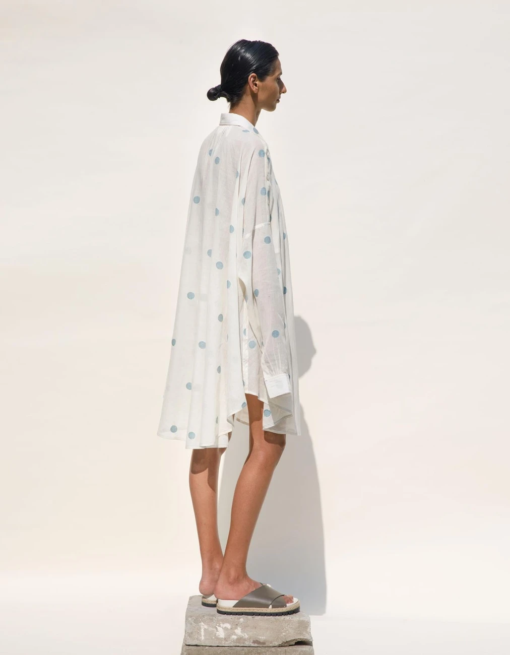 - Buttoned-down, relaxed-fit shirt dress in hand spunjamdani polka dot cotton-silk.