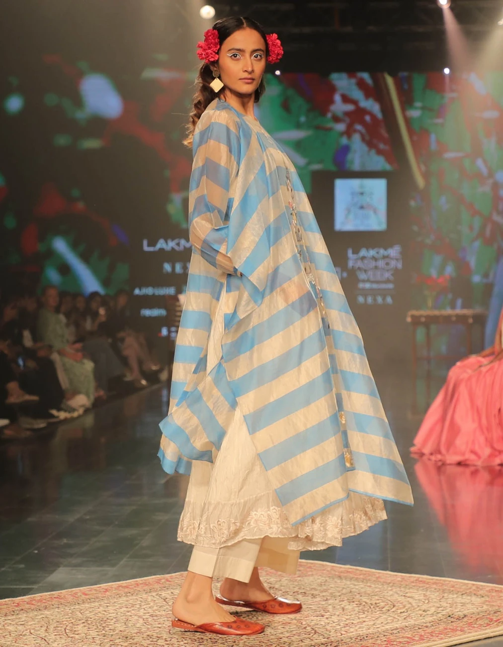 - Sky blue & gold handwoven silk maheshwari stripe dress