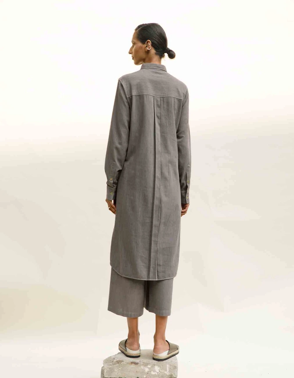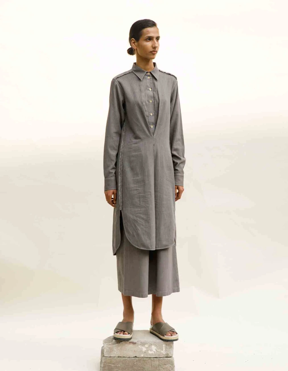 - Long line collared shirt dress in handwoven organic cotton