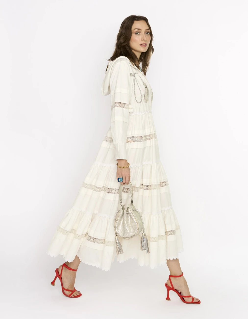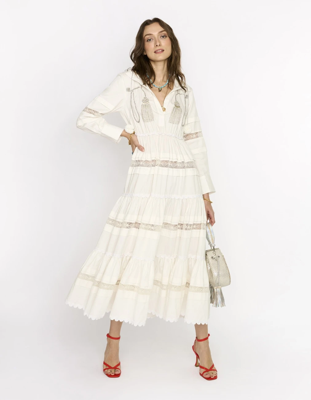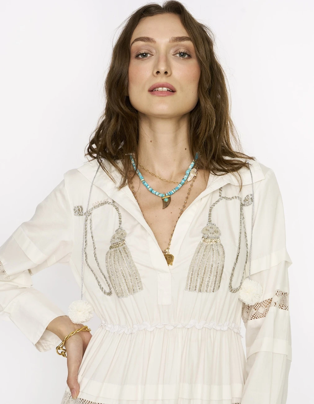 - The gathered long dress with embroidered tassels & lace details