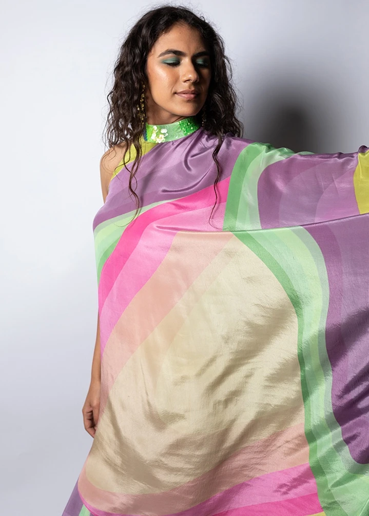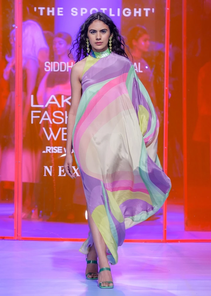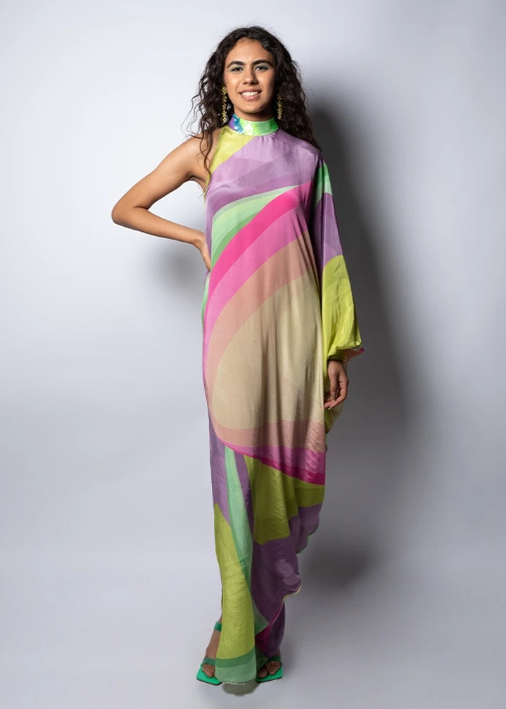 - Cromatic Wave Print, Hand Embroidered One Shoulder Dress With With Side Slit