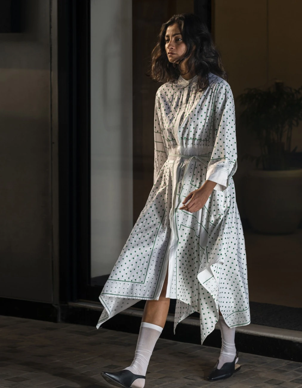 - The dress features a hankercheif hem and embroidered dots in silk threads