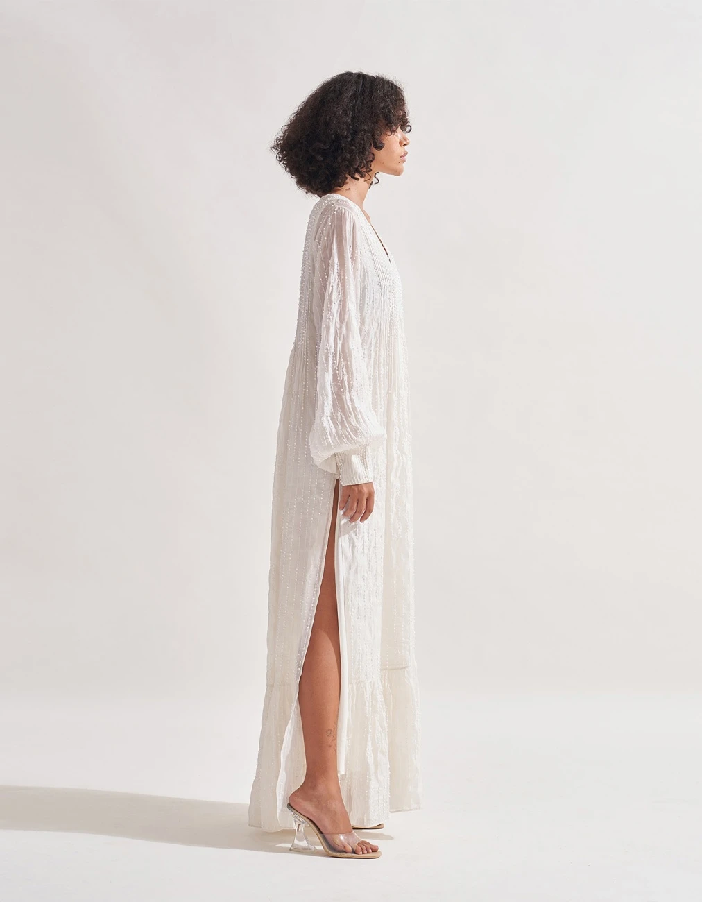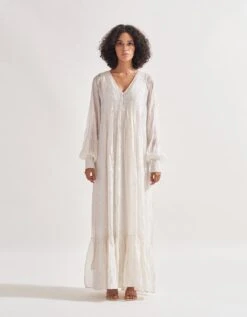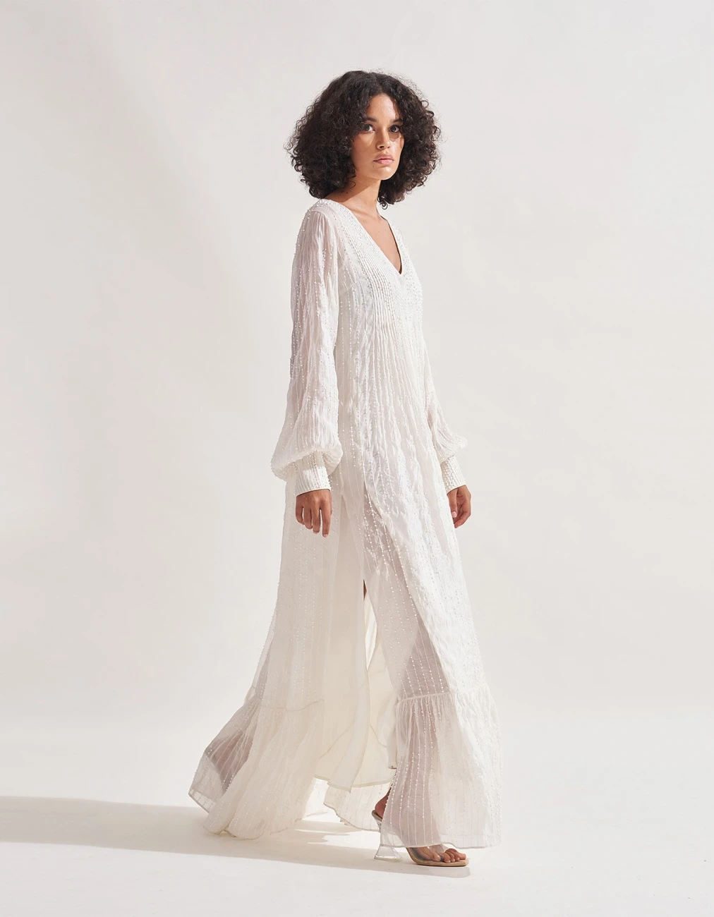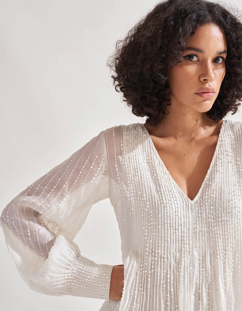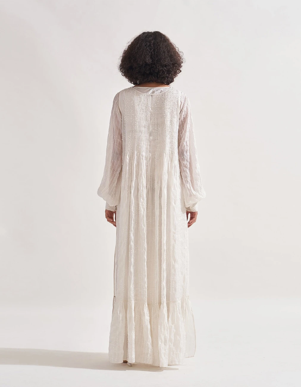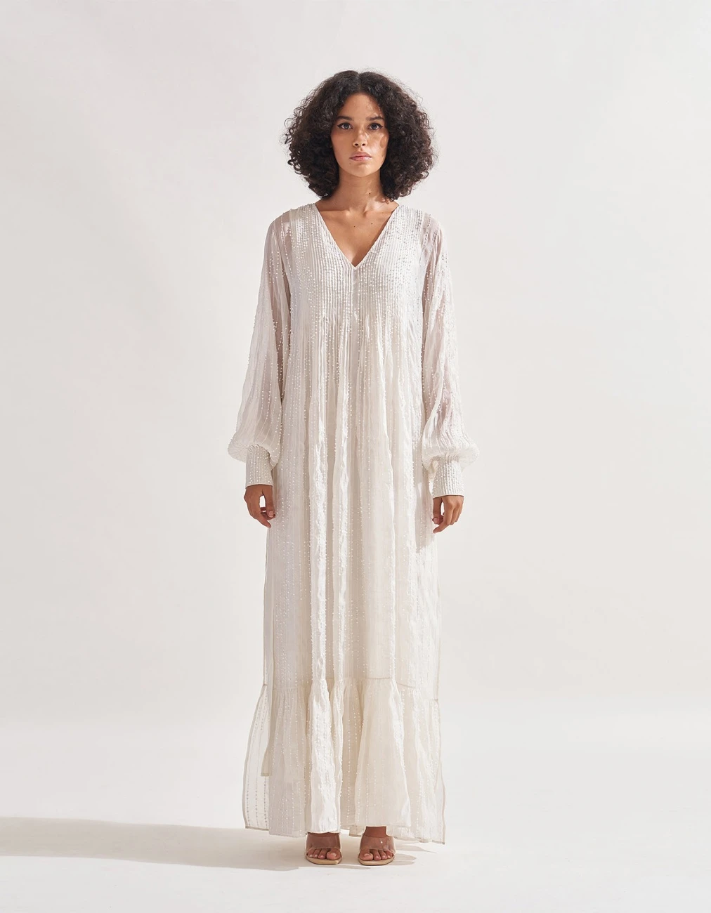 - Hand-woven silk pleated yoke maxi dress with hand-embroidered bead work
