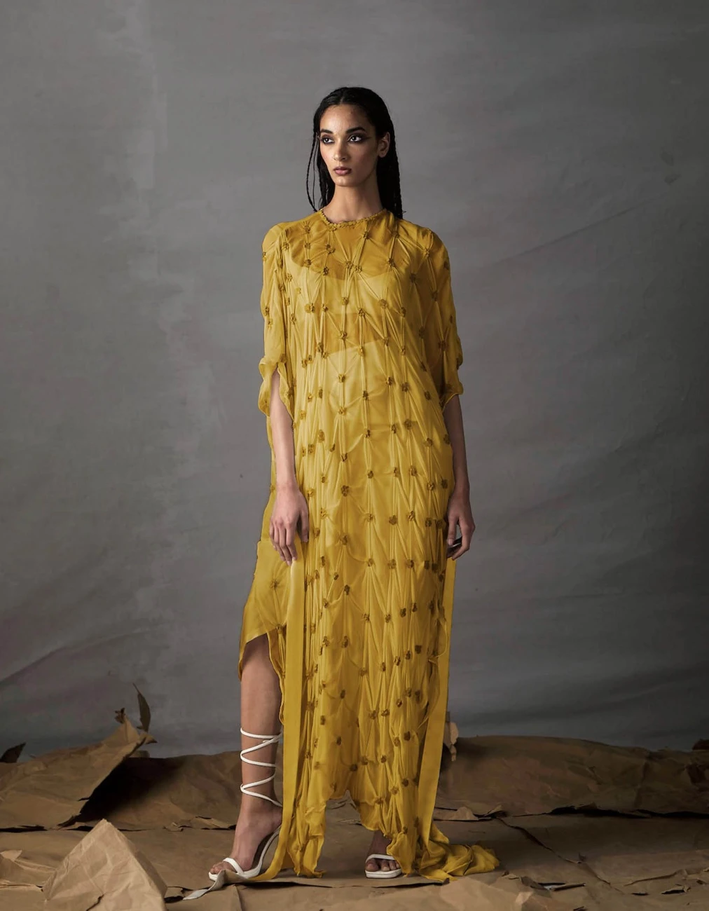 - Silk draped dress with crop top and knotted skirt