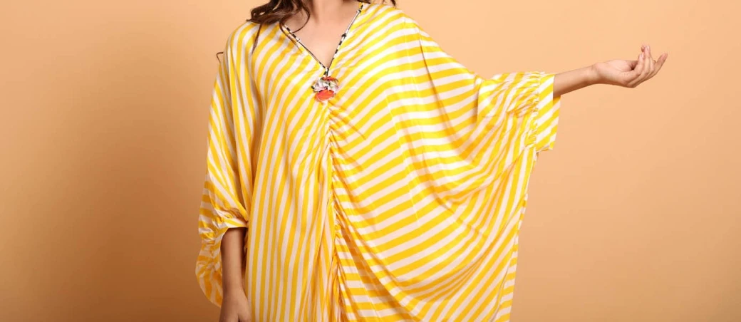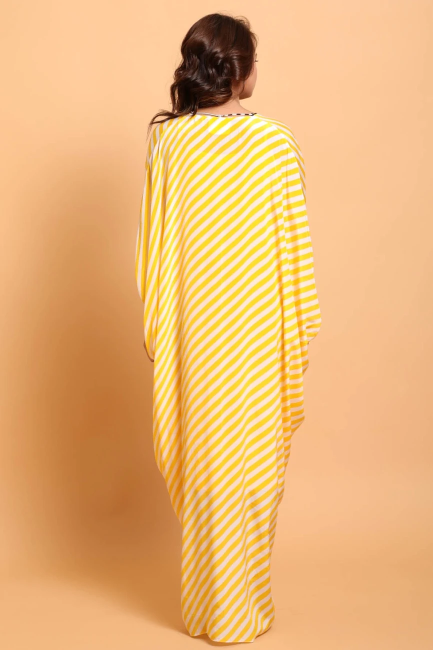 - Yellow white loose crepe sarong style kaftan dress with hand crafted dori and tassels on neckline